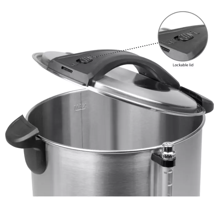 Все під контролем: Встановіть температуру безперервно та відповідно до ваших побажань від 30 °C - 100 °C. Кришка має термоізольовану пластикову ручку з запобіжником. Індикатор рівня інформує вас про вміст, не відкриваючи кришку. Для полегшення очищення можна зменшити.
