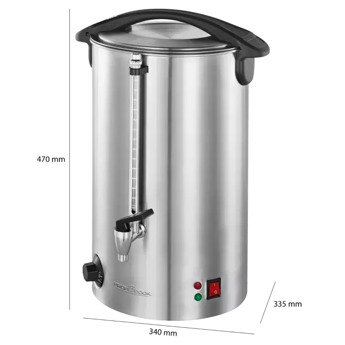 РОЗМІР XXL - PC-HGA 1111 об'єм 16 літрів вміщує особливо велику кількість рідини. Ідеально підходить для заходів, вечірок чи інших урочистостей. ВИСОКА ЯКІСТЬ І ПОТУЖНІСТЬ - у корпусі з високоякісної нержавіючої сталі та потужності 1500 Вт машина особливо швидко нагрівається. Пристрій також відрізняється міцним металевим хромованим краном.