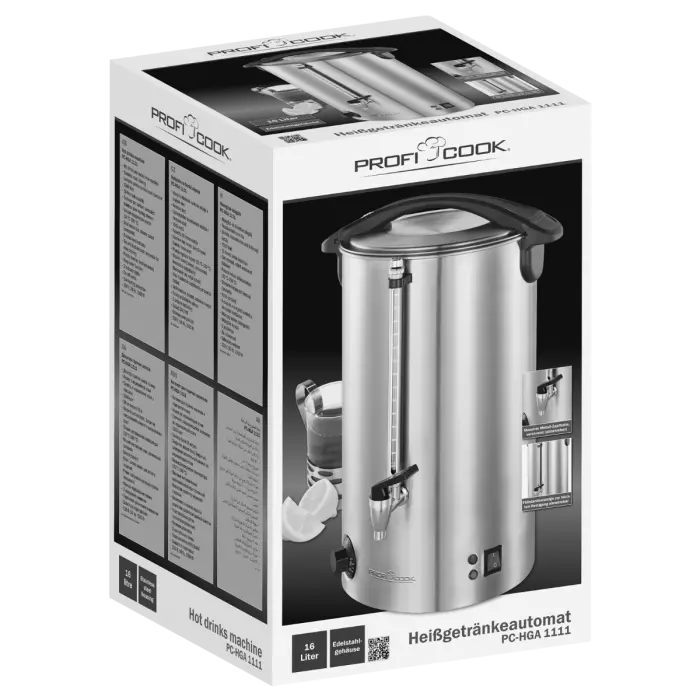 Термопот PC-HGA 1111 від ProfiCook дозволяє розігріти або тримати широкий асортимент напоїв, такі як глінтвейн, кава або чай. Ви також можете легко розігріти супи в машині. З PC-HGA 1111 гарячі напої завжди під рукою. З потужністю XXL до 16 літрів, гарячих напоїв. Корпус з нержавіючої сталі високої якості. ідеально підходить для проведення великих заходів та вечірок.