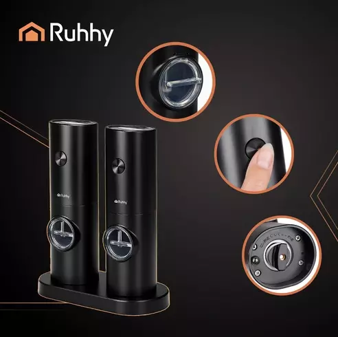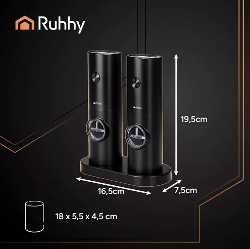 Створіть атмосферу професійної кухні прямо у себе вдома! Цей набір із двох автоматичних млинів від RUHHY не лише функціональний, а й естетично доповнює інтер'єр — сучасний чорний корпус з алюмінію й ABS-пластику виглядає елегантно та мінімалістично. Завдяки потужному керамічному механізму й підсвітці млинці забезпечують зручність навіть при слабкому освітленні — наприклад, під час романтичної вечері.