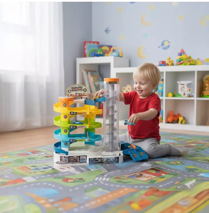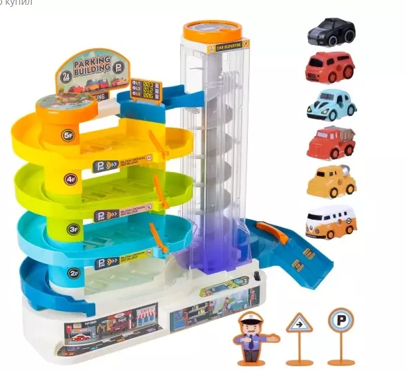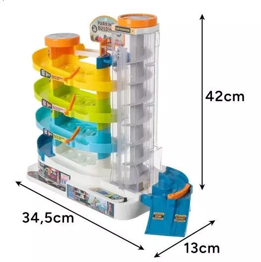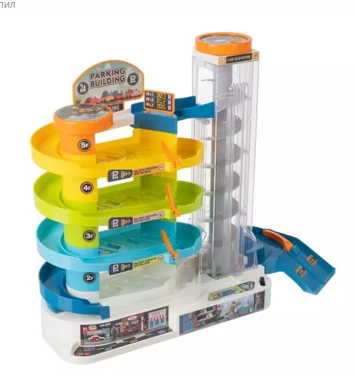 Інтерактивна парковка від Iso Trade — це справжній п’ятиповерховий ігровий комплекс для маленьких любителів машинок. Спіральний ліфт із ручним або електричним приводом піднімає автомобілі на верхній рівень, звідки вони захопливо спускаються трасою донизу.