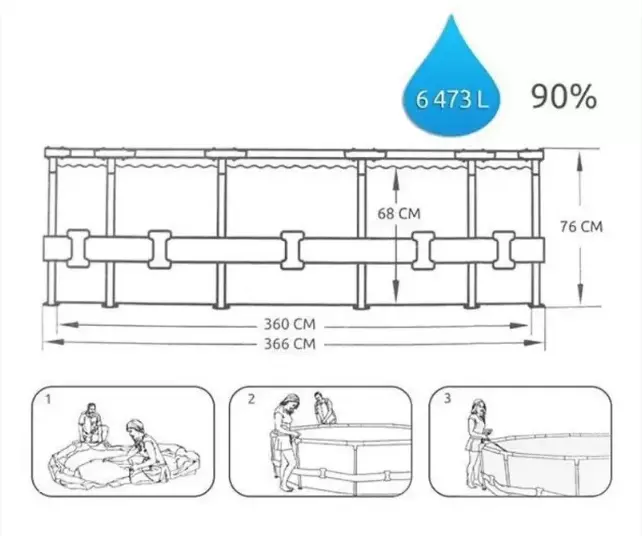 Каркасні басейни міцніші та місткіші, а завдяки рівним стінкам їх можна заповнювати до 90% об’єму. Басейн вміщує до 6473 літрів води. Оснащений надзвичайно міцною сталевою рамою, яка забезпечує високу стійкість та довговічність конструкції.
