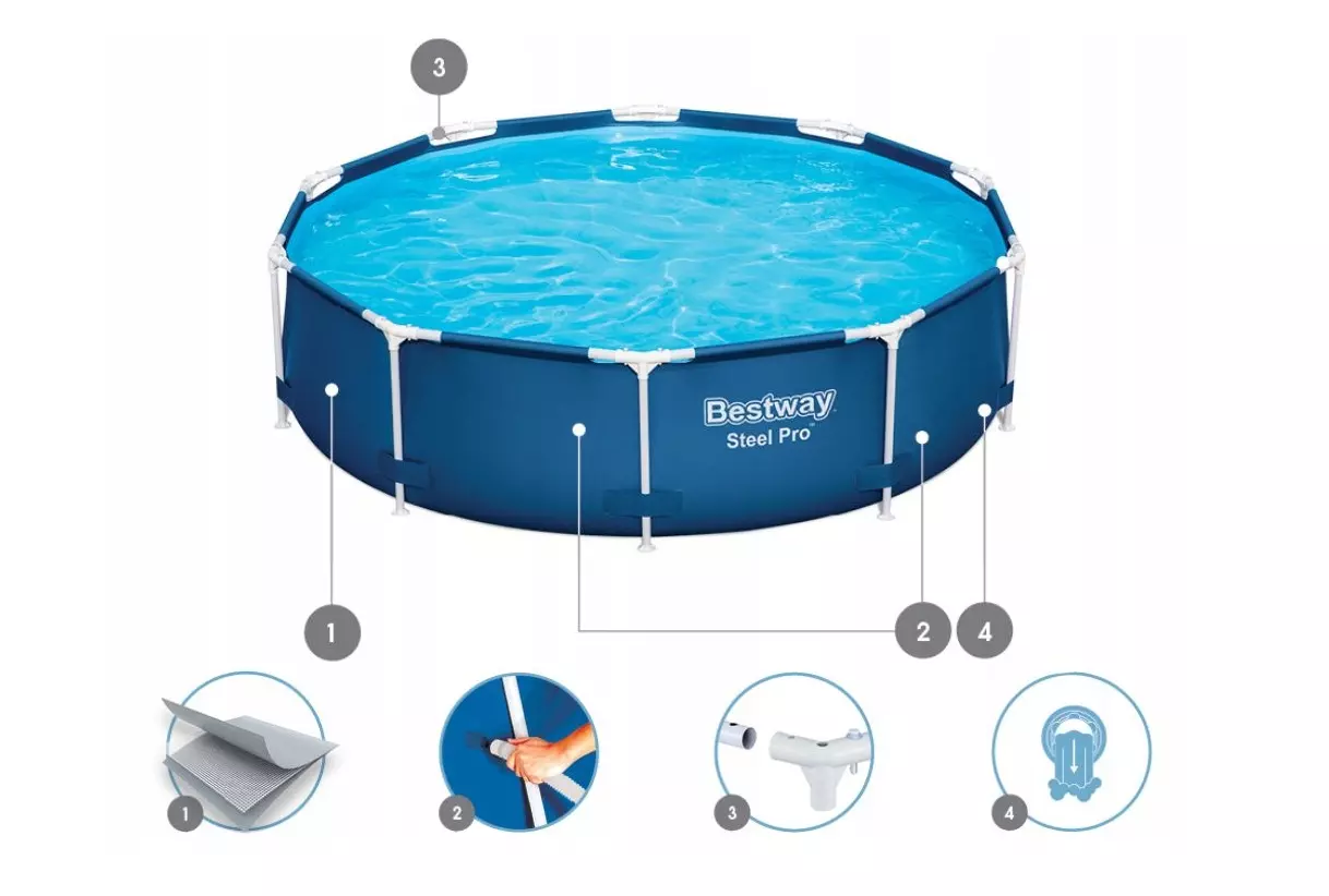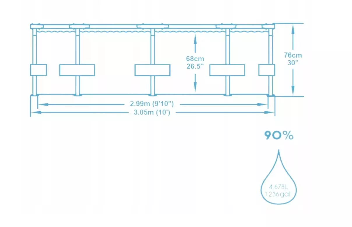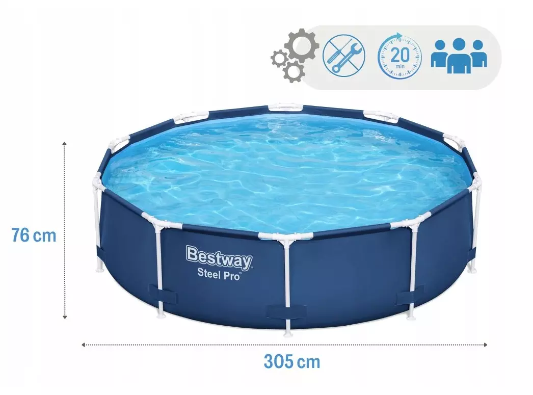Насолоджуйтесь літом у повній мірі разом із каркасним басейном діаметром 305 см і висотою 76 см, що вміщує до 4678 літрів води! Завдяки сучасній конструкції та якісним матеріалам — це ідеальне рішення для сімейного відпочинку просто у вашому саду.