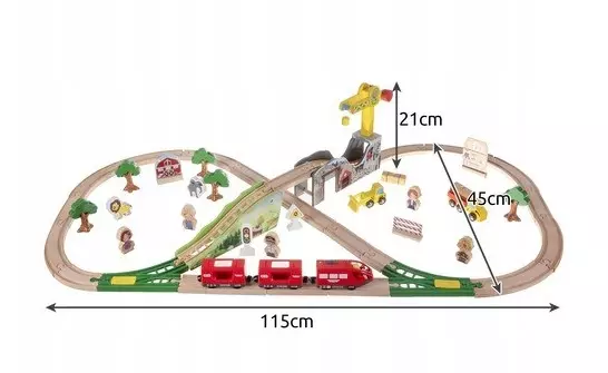 ВЕЛИКИЙ НАБІР З 57 ЕЛЕМЕНТІВ - набір складається з 57 точно виготовлених і гарно закінчених елементів, які можна скомпонувати відповідно до власних ідей. Набір включає, серед іншого, колію, пасажирський потяг, будівельні вагони, набір дерев і знаків, фігурки, тварин і кран. Елементи поїзда з'єднані за допомогою магнітів. Магніти сильні - не відпускають навіть при піднятті всього набору.