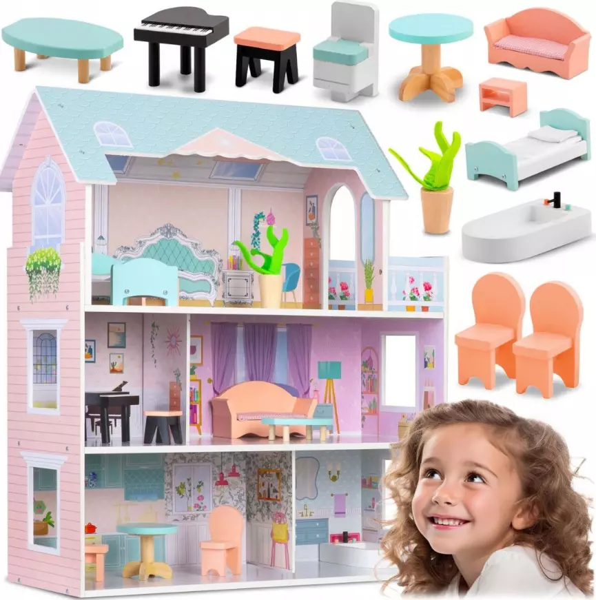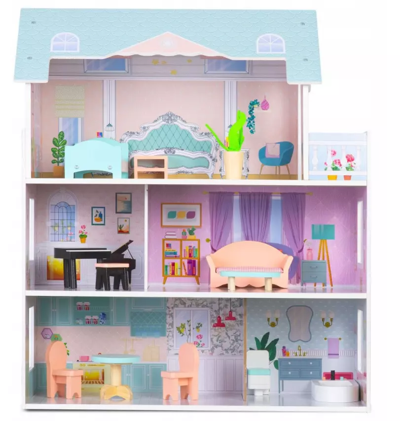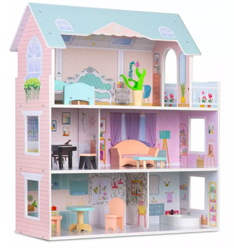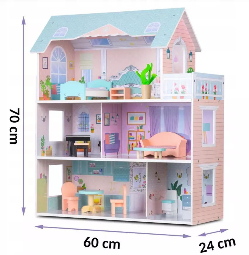 Будинок у гарних тонах, з великою кількістю дерев'яних меблів не залишить вашу дитину байдужою! Основні характеристики: У комплекті дерев'янні меблі! цілих три поверхи в будинку стабільна, міцна конструкція просте складання