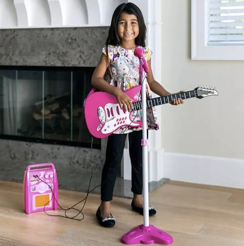 Фантастична гітара для молодих рокерів. гітара з мікрофонним підсилювачем — це пропозиція для дітей, які люблять виступати перед аудиторією. Електрична гітара має 6 металевих струн, чутливих до торкання.