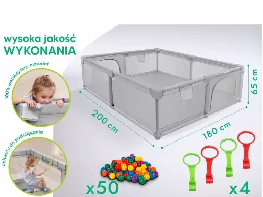 Дитячий манеж XXL 180×200 см із ручками для підйому та 50 кульками для гри — ідеальне місце для розвитку та розваг малюка!