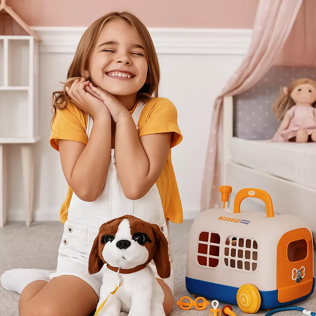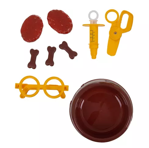 Повний набір аксесуарів – у комплект входять стетоскоп, ножиці, шприц, захисний нашийник, мисочка, корм, а також плюшевий песик із нашийником та повідком. Все необхідне, щоб відкрити власний ветеринарний кабінет!