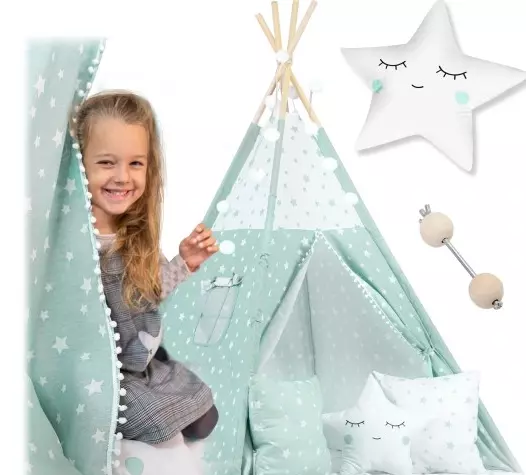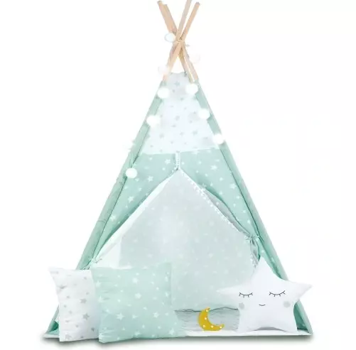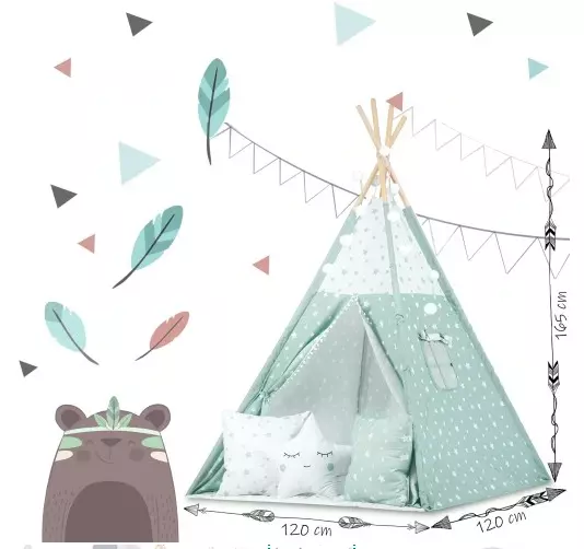 Створіть унікальний ігровий куточок для вашої дитини з нашим тіпі-наметом у ніжному м’ятному відтінку. Цей намет у стилі індіанського житла — ідеальне поєднання комфорту, безпеки та модного дизайну, що надихне вашу дитину на цікаві пригоди та творчі ігри.