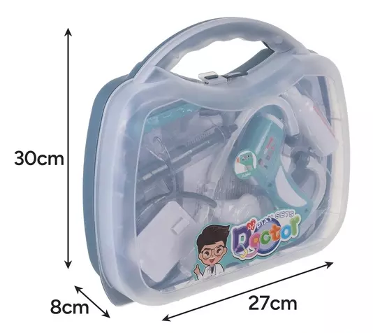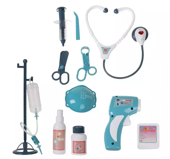 13 аксесуарів у комплекті – стетоскоп, шприц, термометр, антисептик, пінцет, окуляри, карта пацієнта, таблетки, флакон, балон з киснем тощо – повноцінний набір лікаря в одному кейсі!