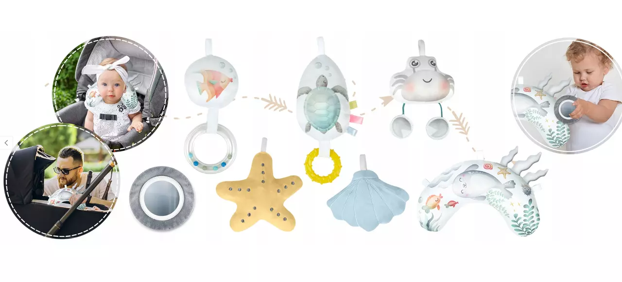 7 багатофункціональних іграшок: із дзеркалом, пищалкою, шарудливими та звуковими елементами.