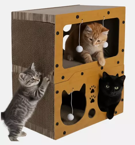 Двоярусна конструкція з міцної HDF-плити забезпечує стійкість і безпеку, а наповнення з натурального гофрованого картону ідеально підходить для сточування кігтів.