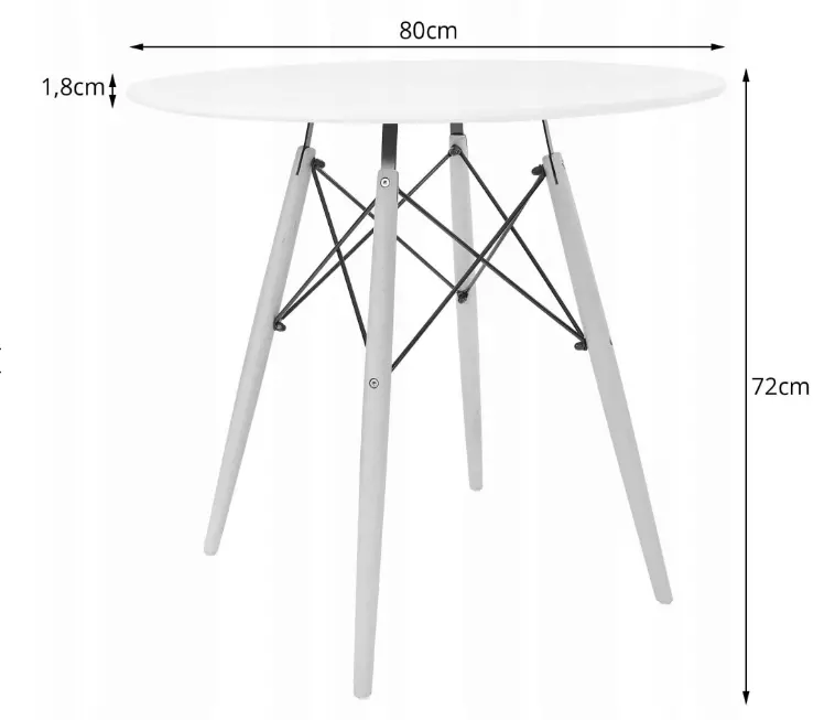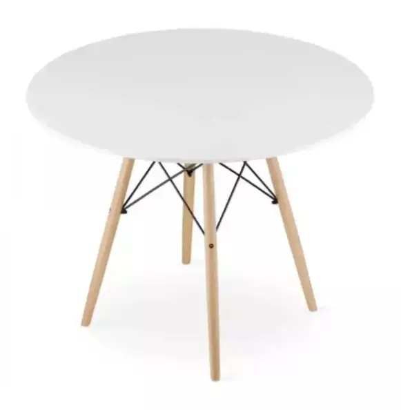 Стіл — білий колір, стільниця з МДФ із матовим покриттям, ніжки з букової деревини, посилені сталевим каркасом.