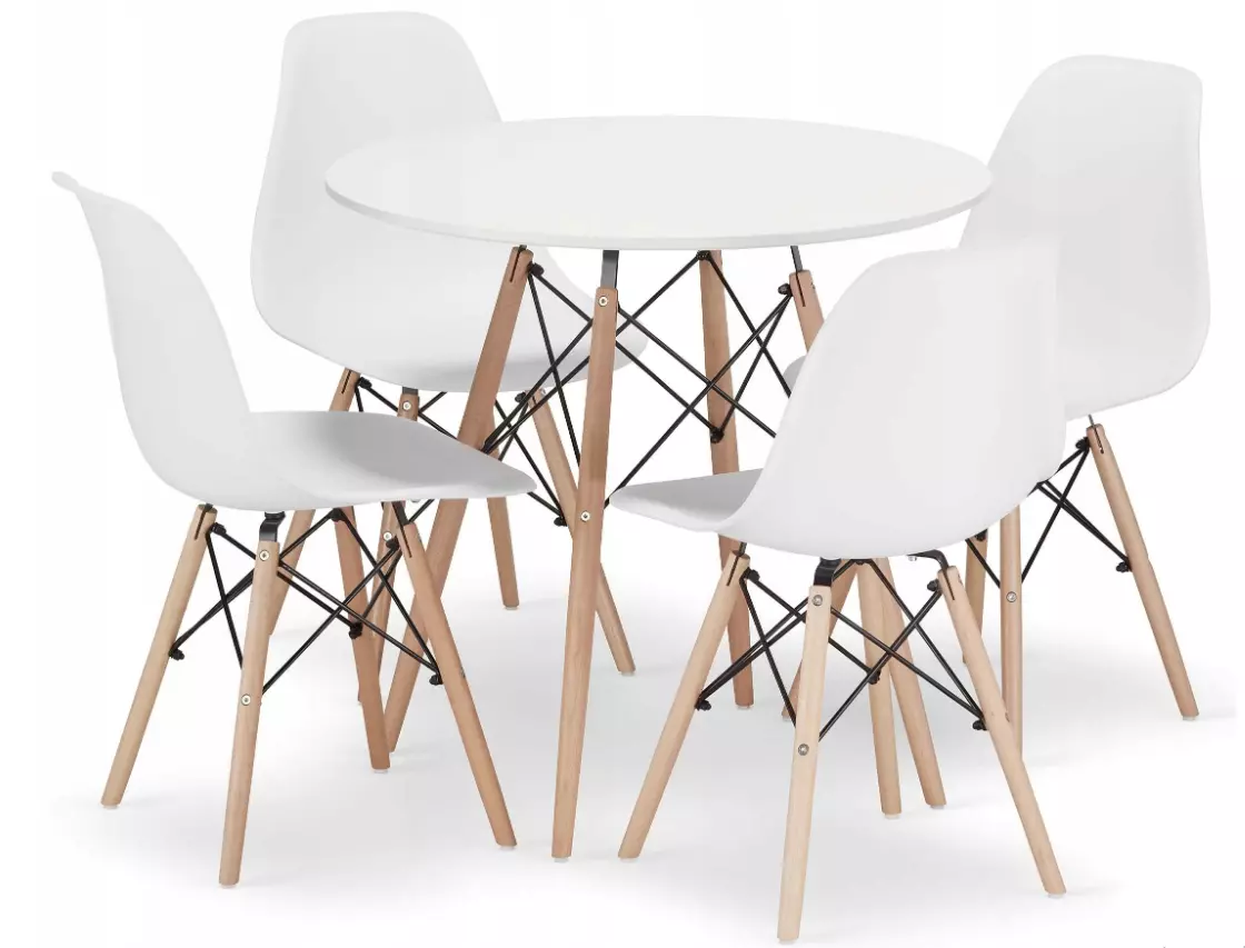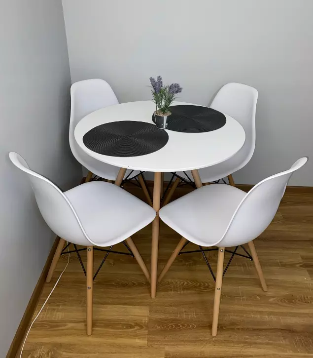 Стильний набір поєднує сучасний скандинавський дизайн, практичність та довговічність. Ідеальне рішення для кухні, столової або вітальні – компактний круглий стіл із чотирма стільцями створює затишний простір для сніданків, обідів і вечерь, а також робить інтер’єр сучасним і елегантним.