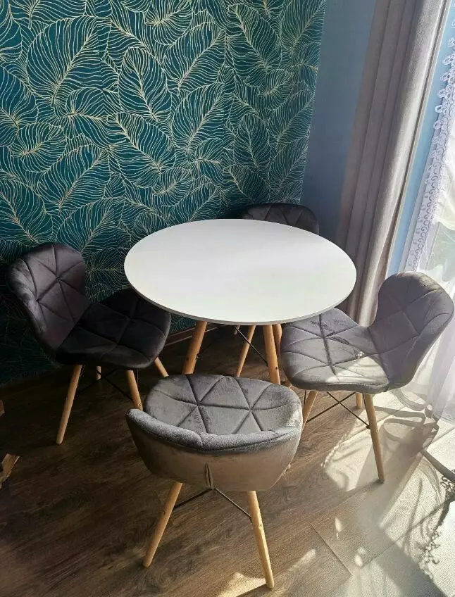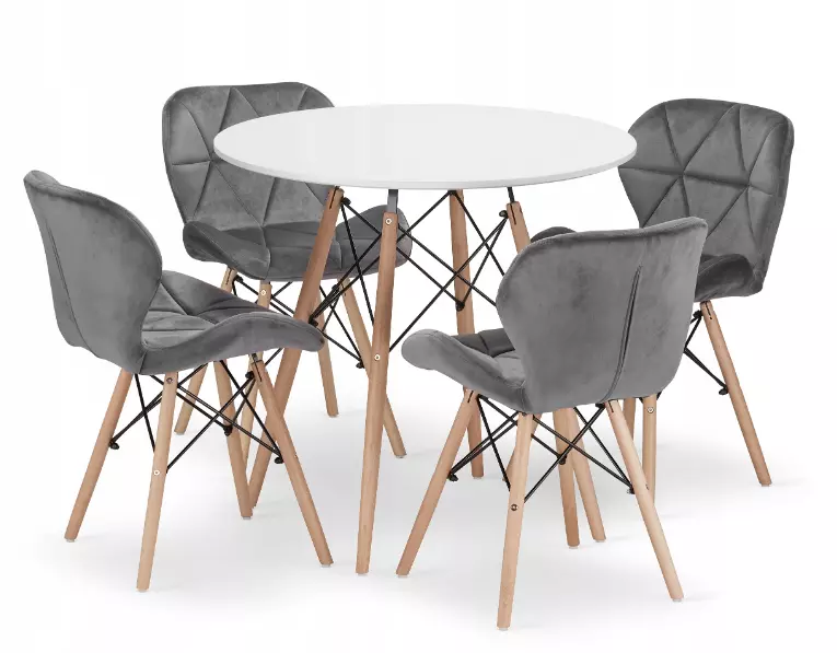 Цей набір поєднує елегантний білий круглий стіл і 4 сірі бархатні стільці, створюючи гармонійну атмосферу у вашій вітальні, кухні чи їдальні. Простота форм, функціональність та довговічність роблять його чудовим вибором для щоденного використання.