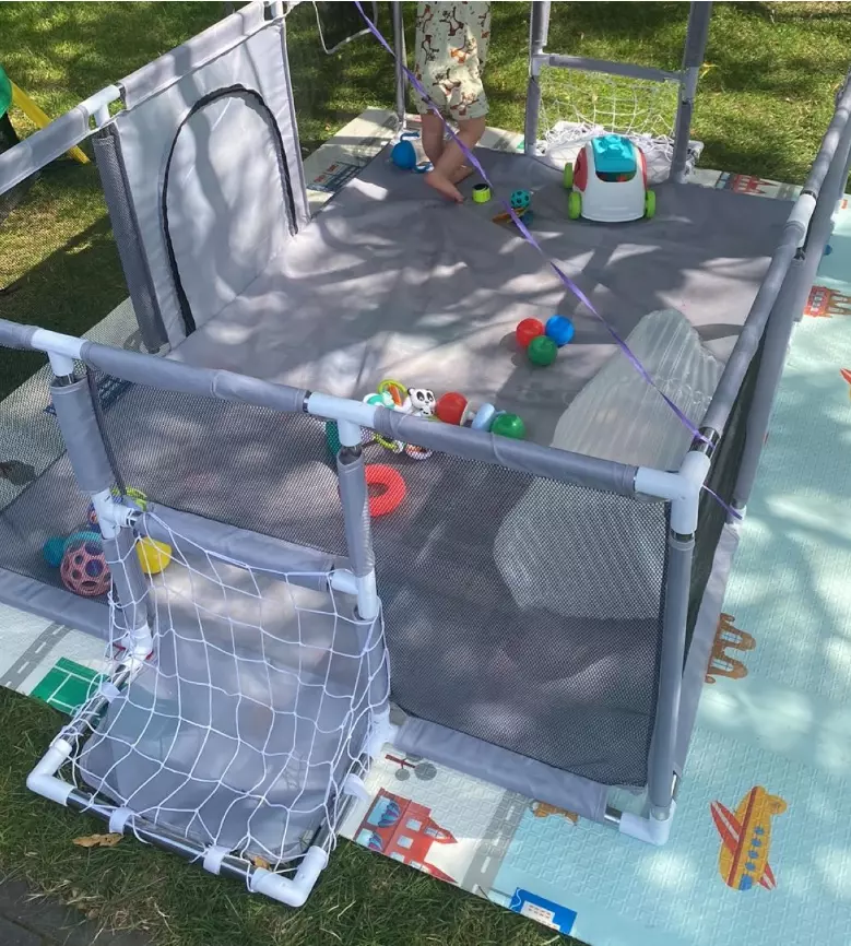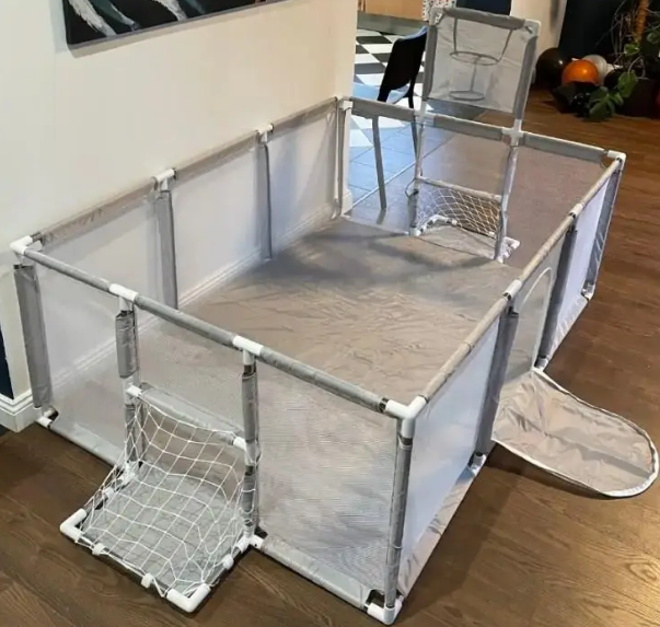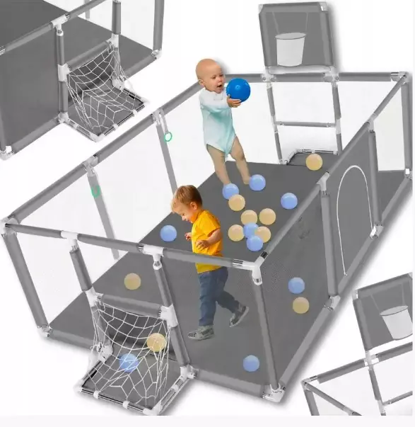 Манеж легко розкладається і складається, займаючи мінімум місця — ідеальне рішення для дому. Оснащений двома футбольними воротами, баскетбольним кільцем та виїзними дверцятами для активних ігор і розвитку рухових навичок.