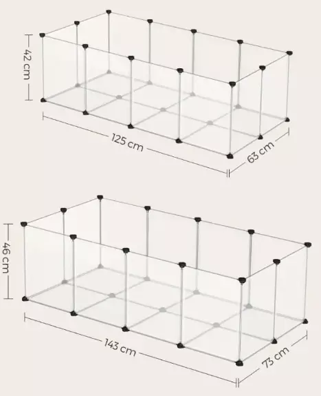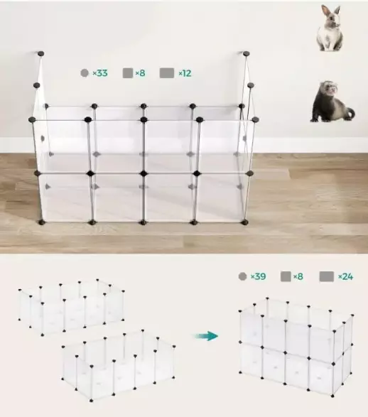 Якщо ви хочете використовувати загін для живих тварин, таких як кролики, тхори або шиншили, збільште висоту стінок. Для цього рекомендуємо придбати другий набір, щоб не зменшувати вільний простір, в якому буде рухатися тварина.