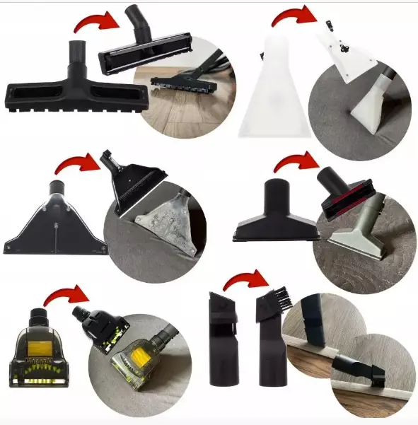 Різноманітні поради для різних застосувань - від пилососу до миття підлоги та прання оббивки. У набір входить 6 наконечників для миття підлоги, які призначені для чищення гладких поверхонь і килимів, завдяки обертовому валику з синтетичними елементами збору. Вузька насадка з рухомим наконечником ідеально підходить для чищення кутів дивана, плінтусів, стелі та інших куточків. Маленький Т-подібний наконечник ідеально підходить для прибирання килимів та оббивки. Насадка для чищення з розпилювачем води, наконечник розпилювача та щітка для підлоги.