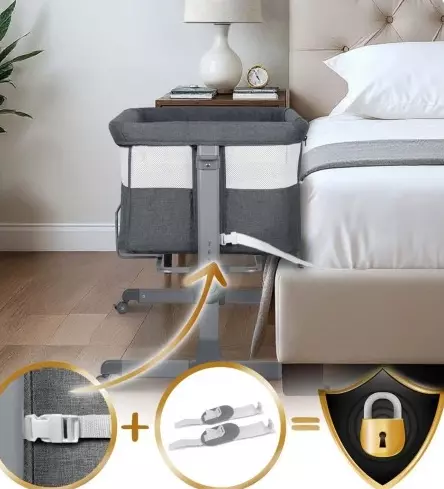 Добавляється до батьківського ліжка — бічний доступ із замком, що дозволяє легко покласти дитину спати, погодувати чи заспокоїти без підйому з ліжка.