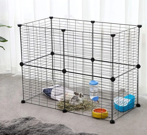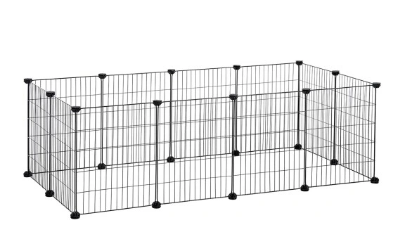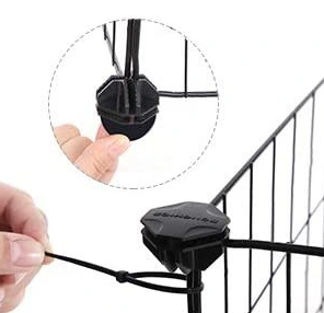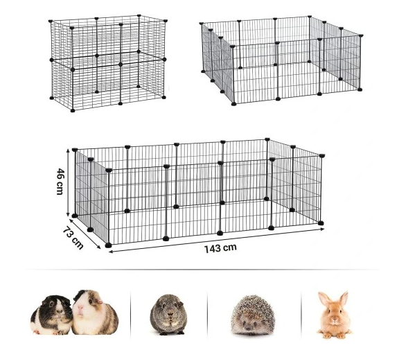 Комплект складається з 12 сітчастих панелей розміром 46 × 36,5 см, які з’єднуються між собою за допомогою пластикових з’єднувачів і кабельних стяжок. Ви можете легко змінювати форму та розмір клітки залежно від потреб — зробити квадратну, прямокутну або іншу конфігурацію.