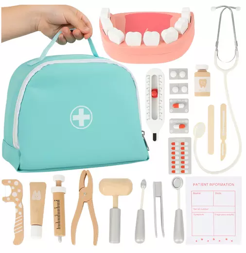 Навчальний набір «Маленький стоматолог Kruzzel» — це ідеальний спосіб познайомити дитину з візитом до стоматолога та водночас розвинути її уяву. У стильній тканинній сумці лікаря знаходяться реалістичні стоматологічні інструменти, виготовлені переважно з дерева, які сприяють творчій рольовій грі.