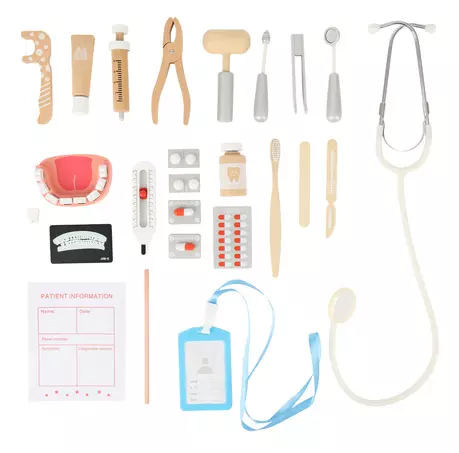 ✔ Реалістичні інструменти — дзеркало, щипці, модель щелепи із зубами, стетоскоп та інші аксесуари допоможуть дитині приміряти роль лікаря.