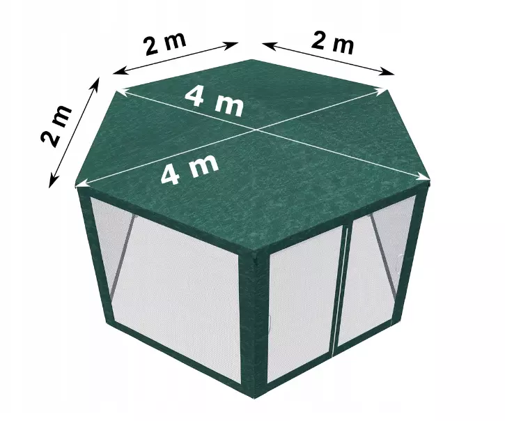 швидка установка на липучці Матеріал ПЕ 100 г/м2 Розміри однієї стіни (ширина x висота): близько 2 м x 2 м 6 стінок з москитною сіткою, в тому числі 1 на блискавці Розміри москитної сітки (висота x ширина) 175 см x 170 см підходить для садових павільйонів з габаритами конструкції близько 3 x 3 x 2,4м