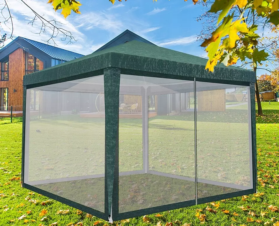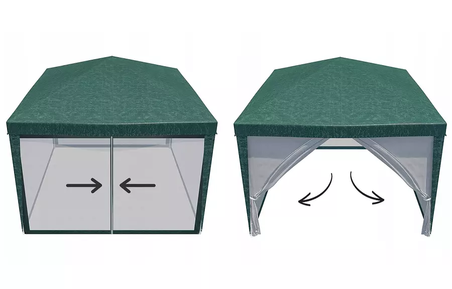 Набір з 4 стінок і даху (вони єдине ціле) дозволяє повністю закрити павільйон, одна з них оснащена блискавкою (вхід).