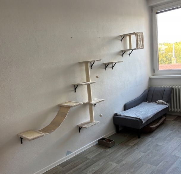 Створіть справжній рай для свого котика! Модульний скалодром Zvonema поєднує 10 елементів: гамак, пісочну печеру, лежанку, підвісний місток і кілька когтеточок із міцного сизалю.