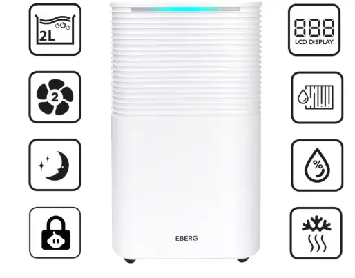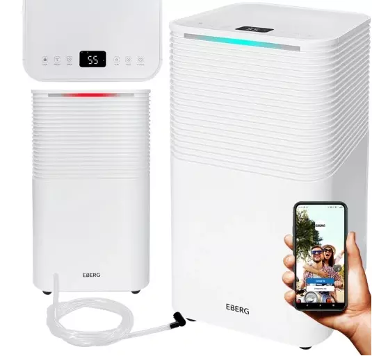 Осушувач EBERG ефективно видаляє зайву вологу, неприємні запахи, запобігає утворенню цвілі. Він ідеально підходить для невеликих та середніх приміщень, таких як спальні, вітальні, кухні, ванні кімнати та підвали. Пристрій оснащений інтелектуальною цифровою системою управління/гігрометром, яка автоматично визначає підвищений рівень вологості повітря та активує функцію