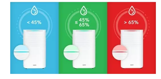 Швидка оцінка вологості завдяки кольоровому світлодіодному індикатору EBERG RICO дозволить швидко перевірити поточний рівень вологості, не підходячи до пристрою. Рівень вологості 65% – червоний