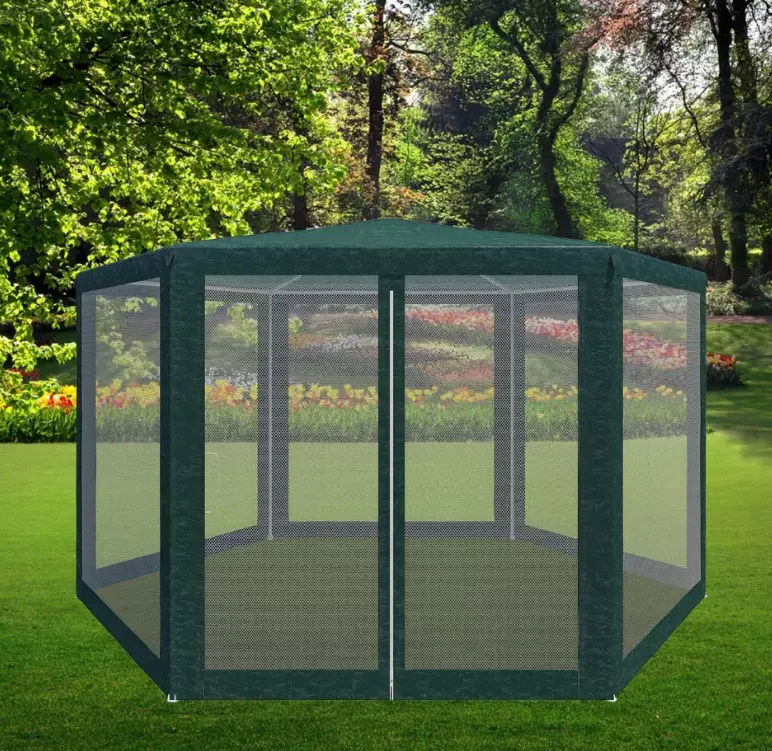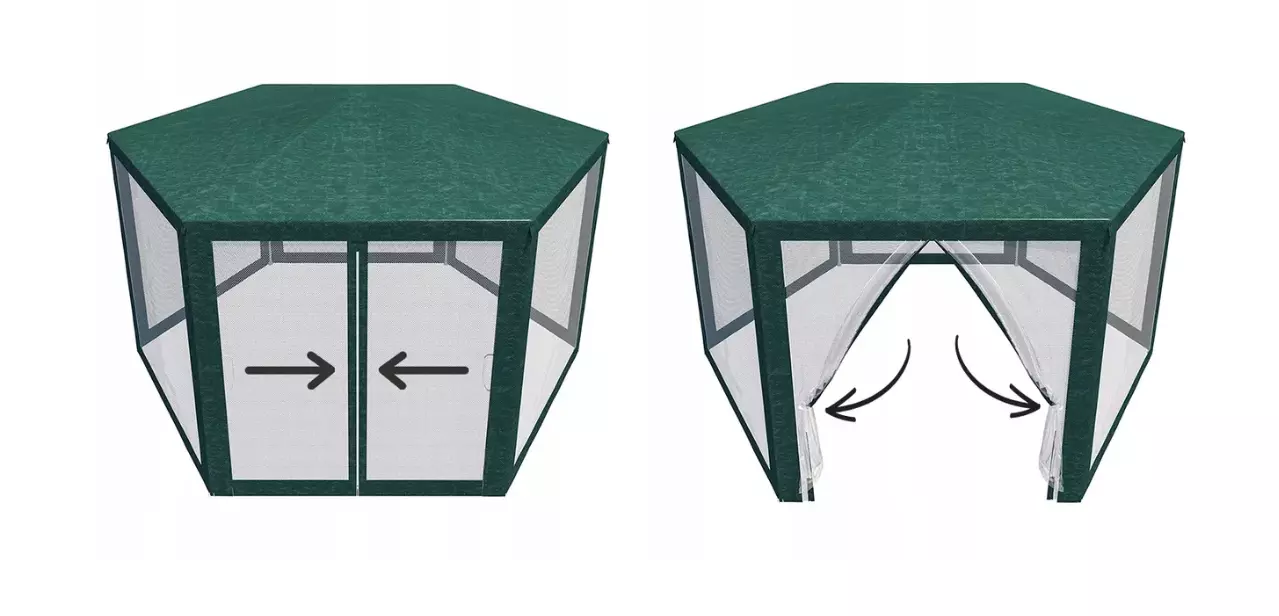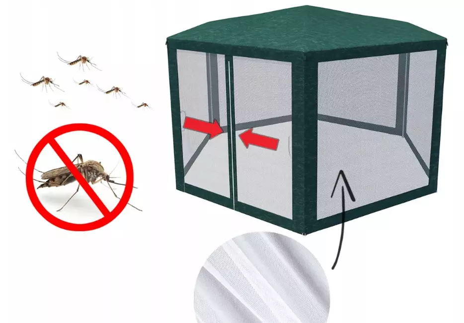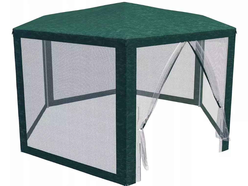 Захищає від сонця, а в поєднанні з москітною сіткою — від комах. 6 стінок із москітною сіткою (корисна площа більша, ніж намети з 4 стінками 3х3 м).