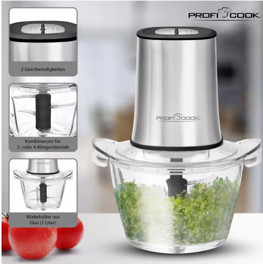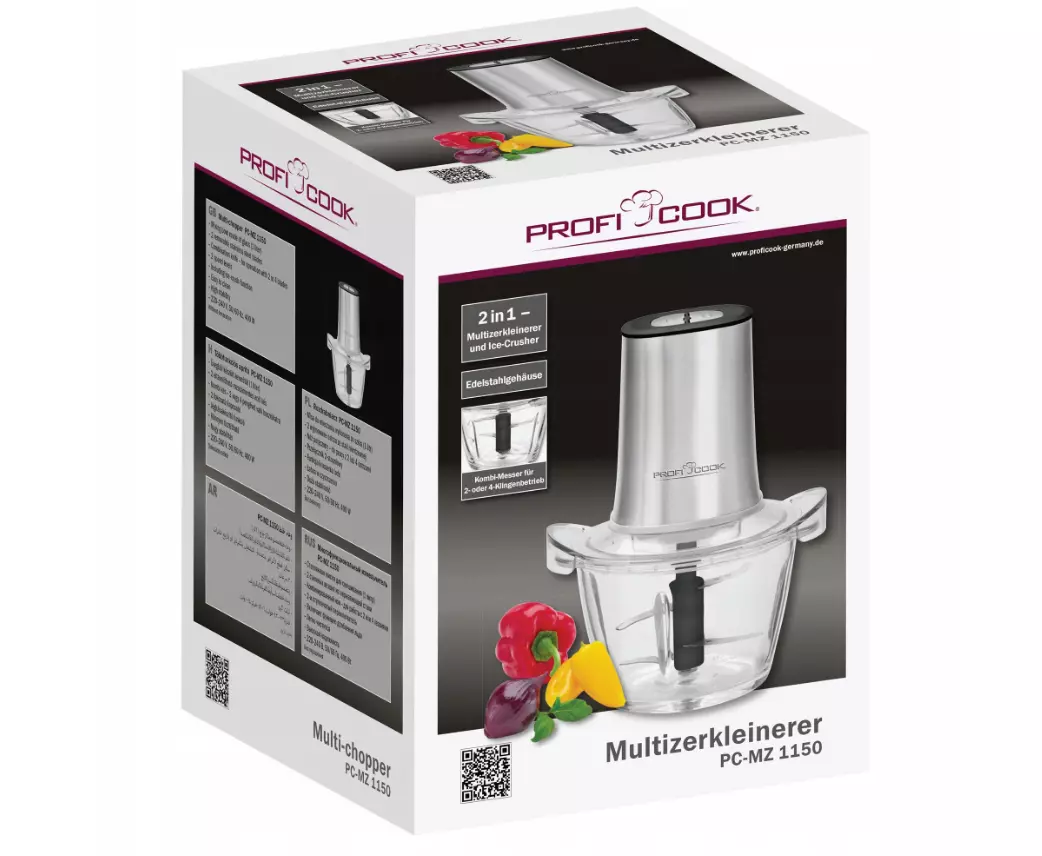 МУЛЬТИ ПОДРІБНЮВАЧ 2 В 1 - крім подрібнення овочів, фруктів, цибулі або часнику, PC-MZ 1150 також швидко і легко переробляє лід. Скляний глечик для змішування вміщує близько 1 літра.