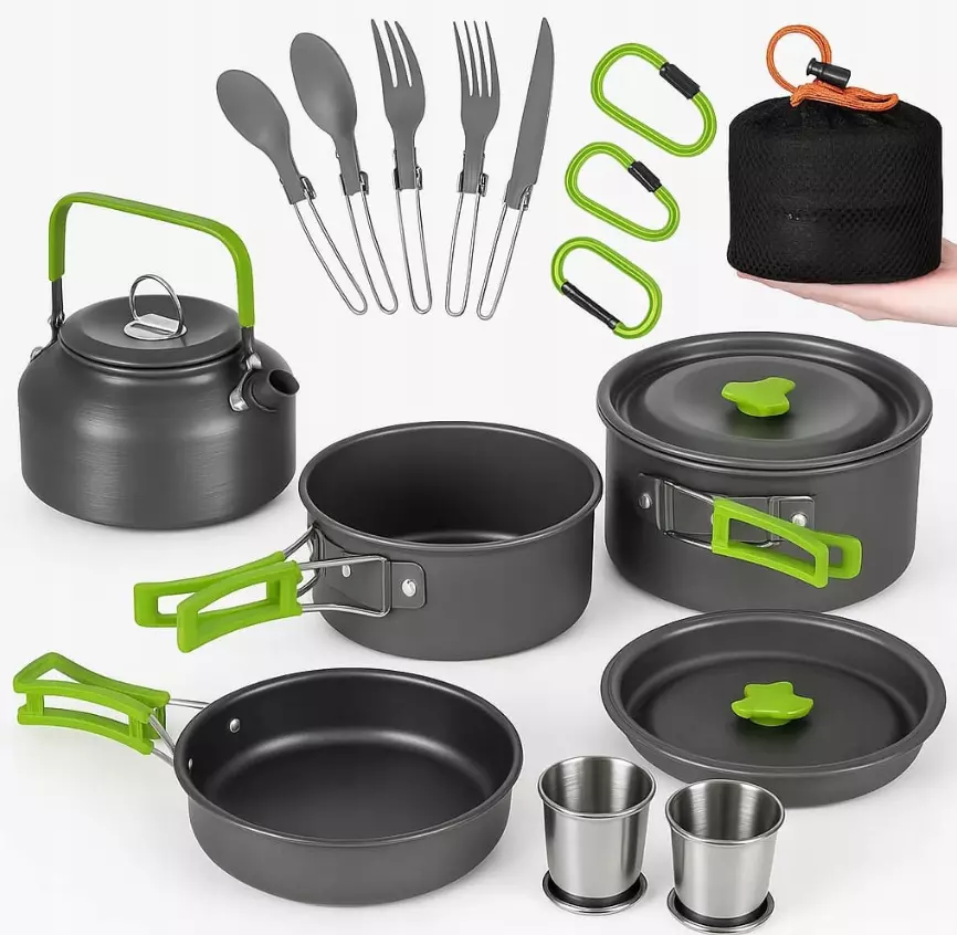 Надійний, компактний та функціональний набір кухонного посуду — ідеальне рішення для кемпінгу, походів, пікніків або навіть для використання вдома. Розрахований на двох осіб, він включає все необхідне для приготування та споживання їжі в польових умовах.