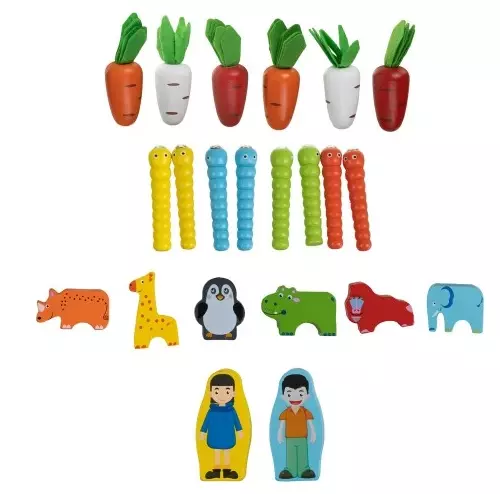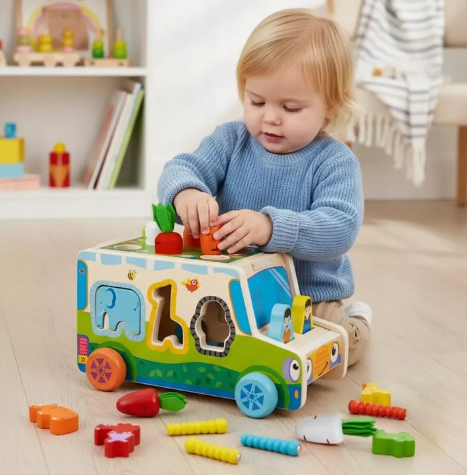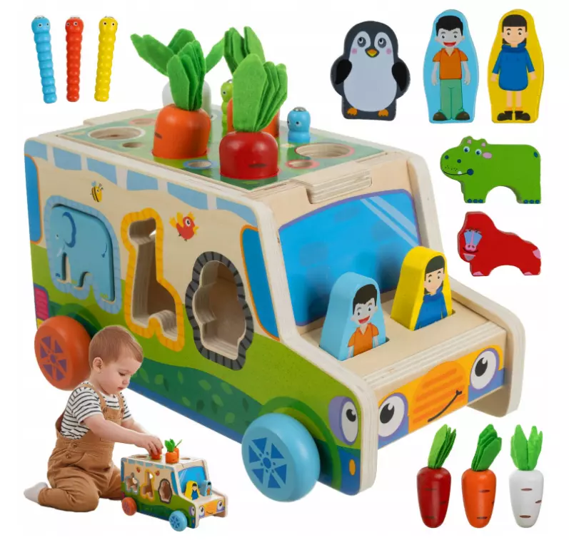 Сортер у формі машинки стане справжнім міні-центром активностей: дітям потрібно ловити гусениць магнітними фігурками, «садити» моркву, розпізнавати фігури та кольори, а також вигадувати власні сюжетні ігри.
