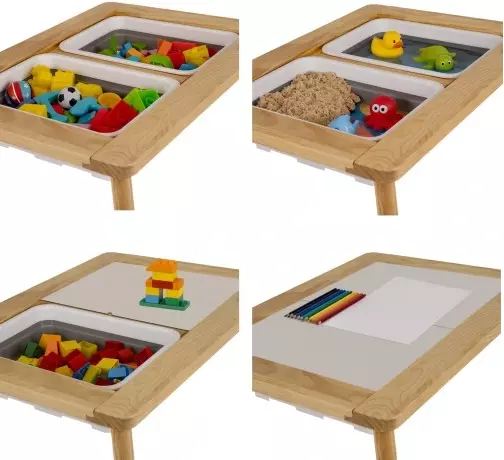 Універсальність та комфорт — двостороння стільниця та два знімні контейнери дозволяють використовувати стіл як пісочницю, стіл для води або малювання; легкоочищувані елементи спрощують прибирання після гри.