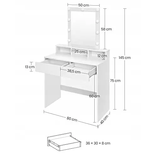 Столик виконаний у скандинавському стилі – сучасний, елегантний і функціональний. Міцна конструкція, широка стільниця та 2 місткі шухляди дозволяють зберігати косметику, аксесуари для догляду за обличчям чи набір для манікюру. Зручне дзеркало значно полегшить процес нанесення макіяжу. Такий туалетний столик – справжній тренд, який ідеально впишеться в інтер’єр спальні або гардеробної.