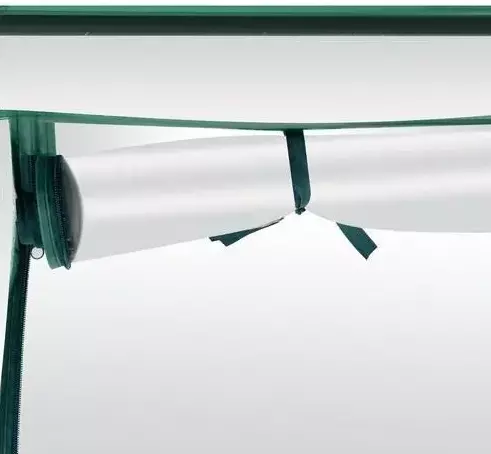 Парник застегивается на молнию, а дополнительные ленты позволяют надежно закрепить фольгу и двери.