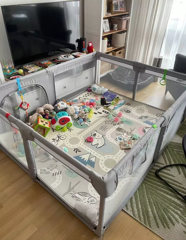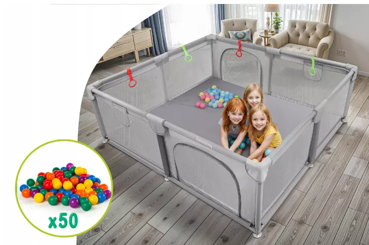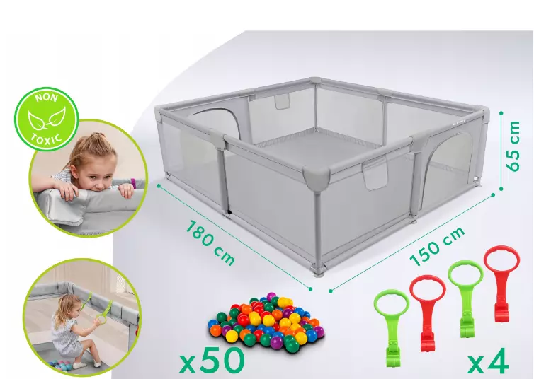 Великий дитячий манеж розміром 150×180×65 см — це зручний і безпечний ігровий простір для малюків з перших днів життя. Він створений для активних ігор, відпочинку та розвитку, забезпечуючи батькам спокій, а дітям — радісне й комфортне дозвілля.