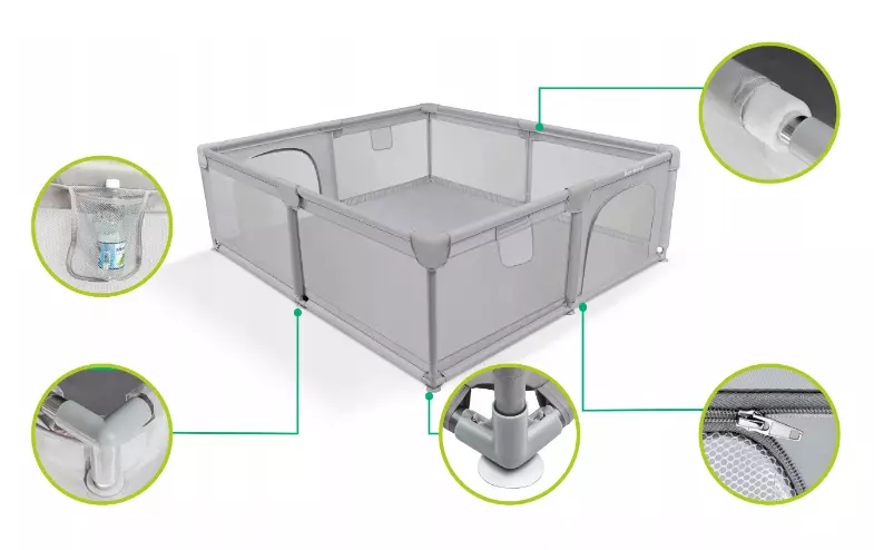 Конструкція оснащена двома боковими входами, що застібаються ззовні. Це зручно для батьків і унеможливлює самостійне відкриття дитиною. Манеж стійкий навіть на слизьких поверхнях — ніжки оснащені міцними присосками. Сітчасті стінки забезпечують хорошу вентиляцію й дозволяють батькам постійно спостерігати за дитиною.