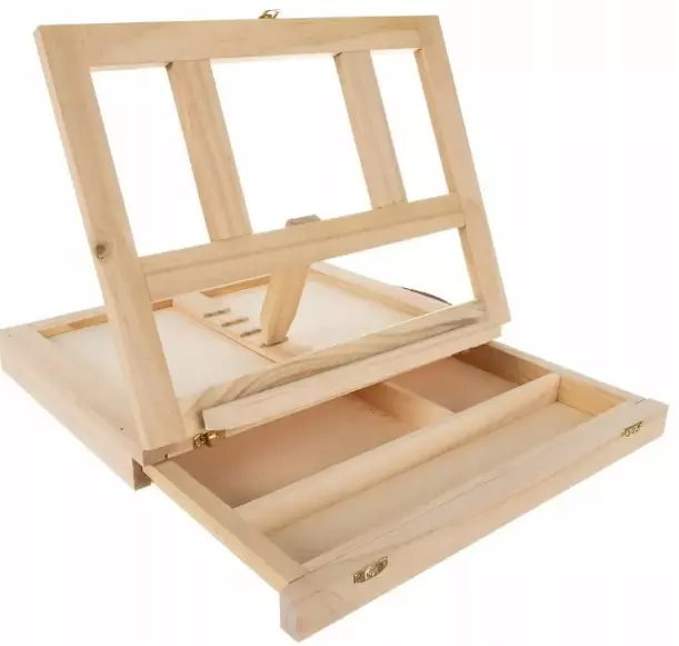Складається у компактну валізу, яка трансформується у повноцінний настільний мольберт із регулюванням нахилу (4 рівні) та тримачем для полотна. Має зручну шкіряну ручку для транспортування і надійні металеві застібки.