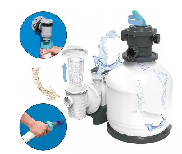 Фільтрувальний насос має верхню частину корпусу, що обертається на 360°, що дозволяє під'єднувати шланги для подачі та зливу води під будь-яким кутом. Крім того, пристрій оснащений манометром для контролю безпеки роботи, а також оглядовим віконцем для сітки, що затримує великі забруднення.