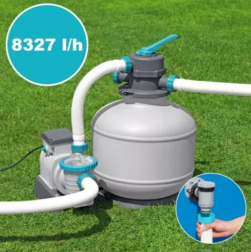 Висока продуктивність насоса (8327 л/год) для басейнів забезпечується баком із піщаним фільтром. Швидкість потоку води дозволяє використовувати пристрій у басейнах об'ємом від 1100 до 51 400 літрів.