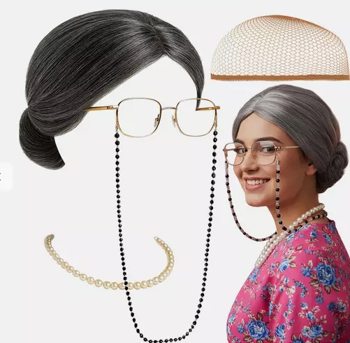 Цей ретро-костюм у стилі бабусі створений для тих, хто хоче додати гумору та оригінальності на Хелловін, карнавальні вечірки або сценічні виступи. Класичний образ доповнюється сивим париком, зібраним у пучок, окулярами на ланцюжку та намистом із імітації перлів, створюючи автентичний і кумедний образ. Універсальний розмір і легка конструкція забезпечують комфортне носіння, а деталі костюму привертають увагу та дарують посмішки.