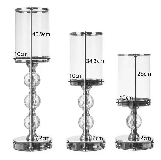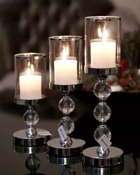 Кожен підсвічник у наборі має індивідуальну висоту — 28 см, 34,3 см і 40,9 см. Декоративні кришталеві елементи на ніжках (від одного до трьох на кожному) надають вишуканості та блиску.
