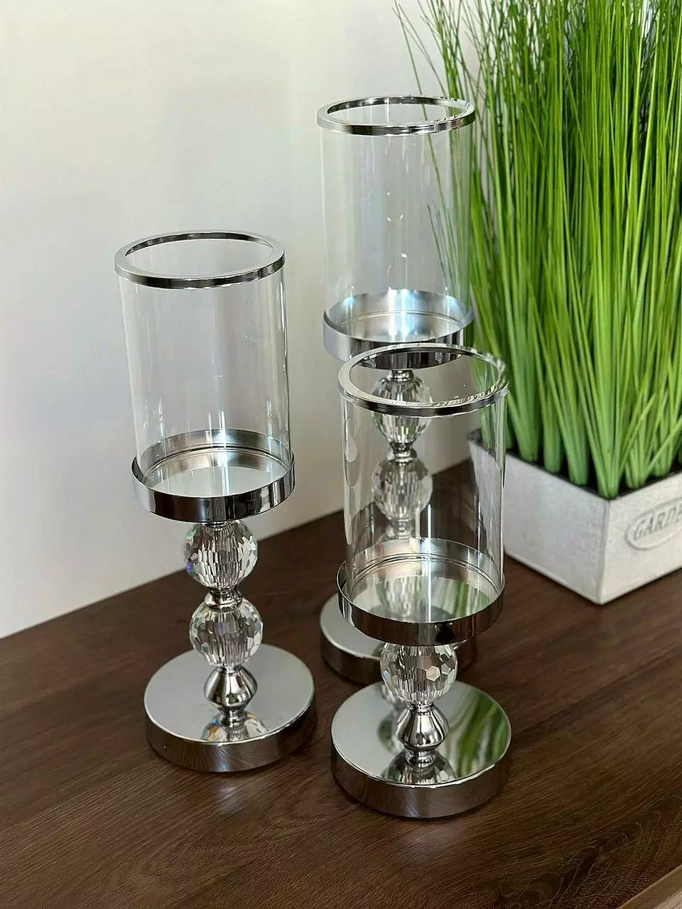 Подаруйте своїй оселі елегантність і теплоту з набором із 3-х підсвічників різної висоти. Стильний дизайн у сріблястих тонах з прозорими кришталевими вставками робить цей комплект ідеальним доповненням до романтичної вечері, святкового декору чи щоденного затишку.